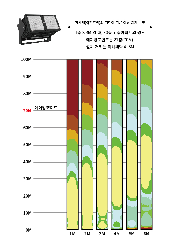 라이트프로의 스포트라이트는 최대 40층 높이까지 빛을 고르게 전달하며, 외벽에만 빛을 집중시켜 인근 건물로의 빛 확산을 최소화합니다.